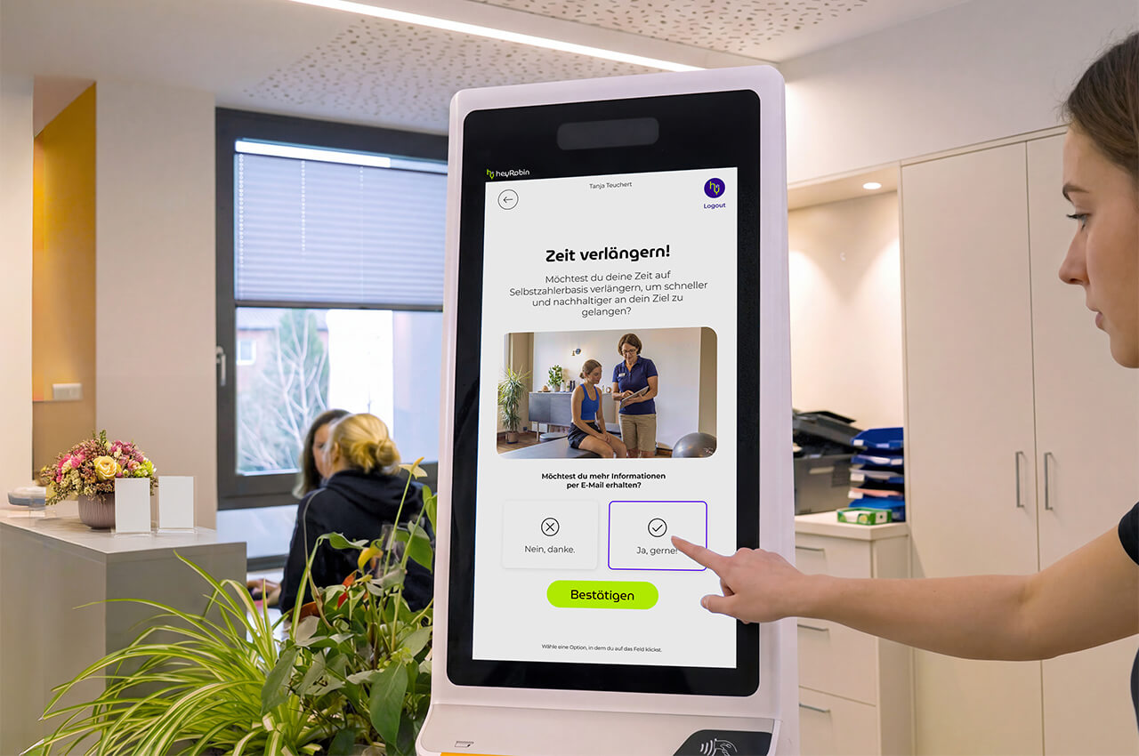 Über einen smarten Self-Service-Terminal können Patient:innen selbstständig einchecken, Formulare wie den Behandlungsvertrag und Datenschutz digital ausfüllen und Zusatzleistungen buchen. Das entlastet den Empfang und schafft gleichzeitig die Möglichkeit, Selbstzahlerleistungen aktiv zu platzieren, ohne dass das Team aktiv verkaufen muss.