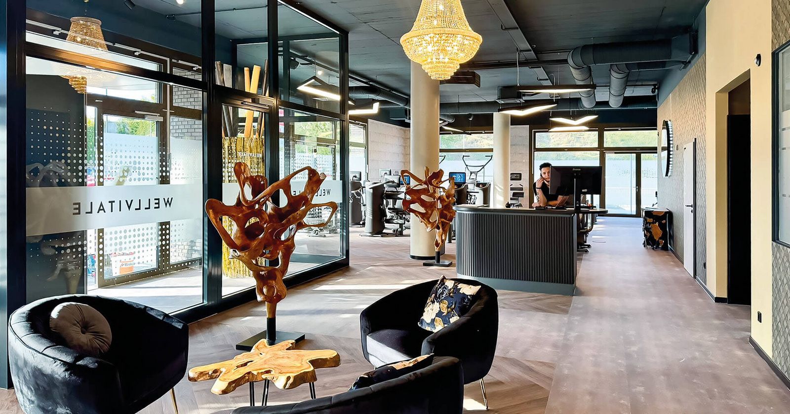 Dass der neueste Wellvitale-Standort alles andere als ein gewöhnliches Fitnessstudio ist, wird mir bereits im Eingangsbereich klar. Vorbei an einer knapp zwei Meter großen, goldfarbenen Vase, richte ich meinen Blick kurz darauf auf den nächsten Eyecatcher – den edlen Kronleuchter, der im Check-in-Bereich von der Decke ragt.