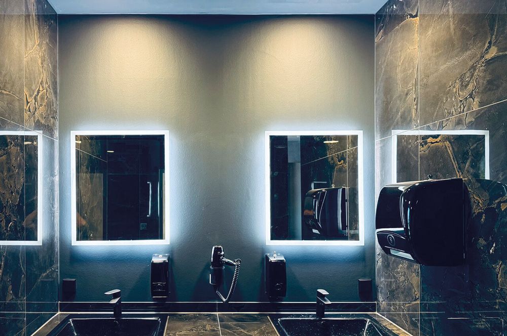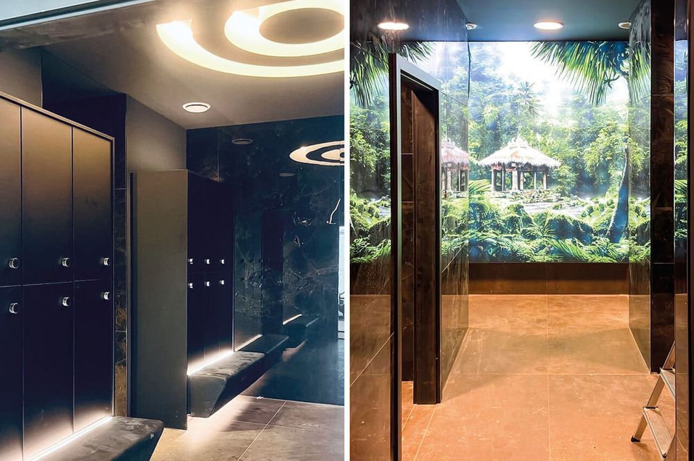 Um die sogenannte Dubai-Lampe anbringen zu können, wurde kein Aufwand gescheut und drei Decken eingezogen. Die Spiegel über den schwarzen Waschbecken sind mit LEDs hinterleuchtet und natürlich stehen den Mitgliedern Föns zur Verfügung. Die mattschwarzen Toiletten reihen sich perfekt ein in das harmonische Gesamtbild der Umkleide.