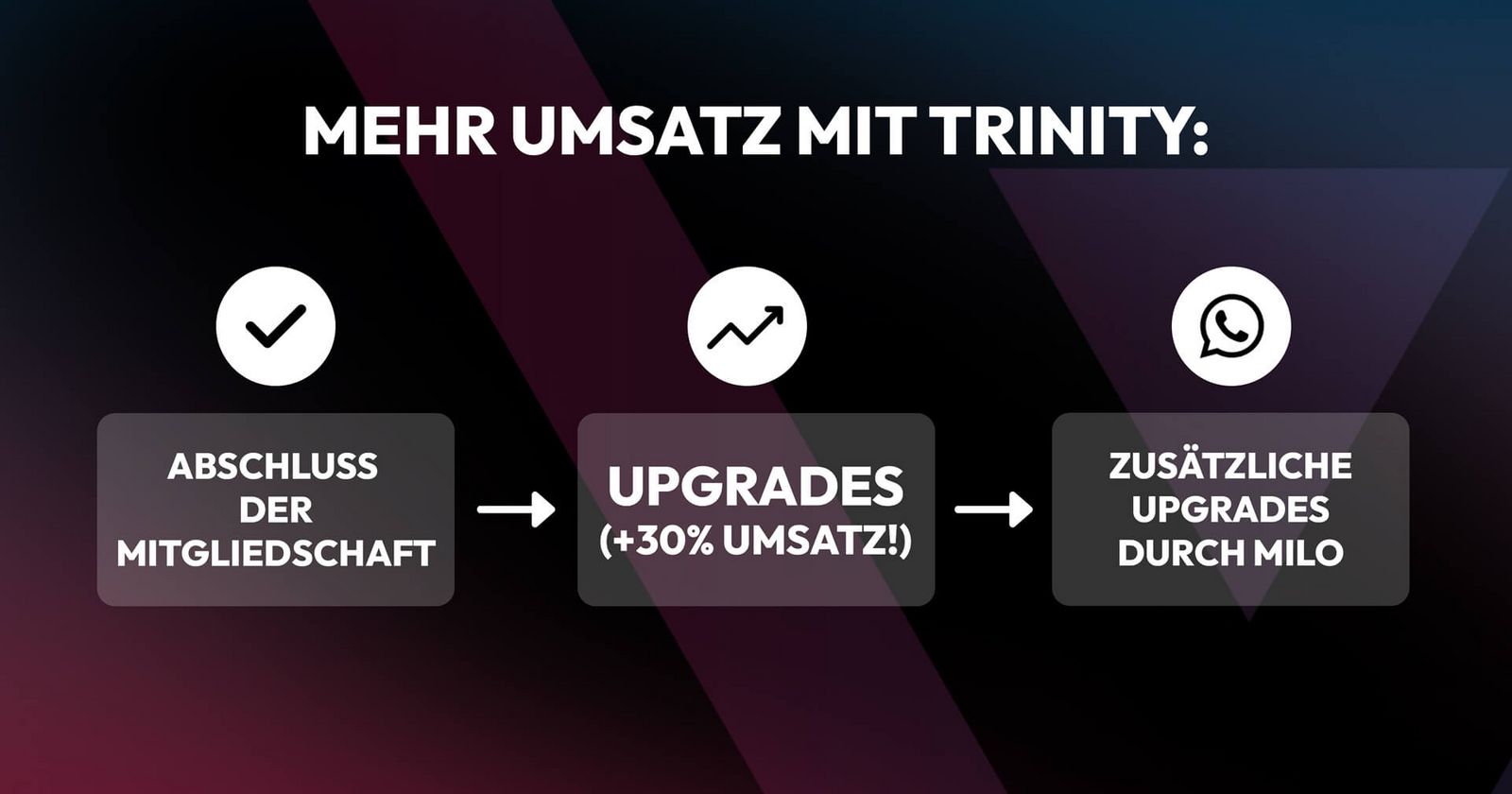 Genau hier setzt das TRINITY-System an. Statt den Interessenten mit Optionen zu überfluten, führt das System ihn Schritt für Schritt durch einen automatisierten, klar strukturierten Prozess. Upgrades werden gezielt und logisch integriert – aber erst, nachdem die Mitgliedschaft erfolgreich abgeschlossen wurde. Anschließend kümmert sich der KI-Chatbot MILO proaktiv um nachträgliche Upgrades der Mitgliedschaften.
