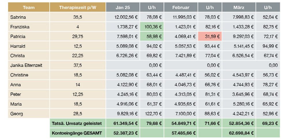- Monatliche Auswertungen von Kontobewegungen und eine Analyse der tatsächlichen Monatsumsätze pro Therapeut schaffen Transparenz über Kosten, Einnahmen und wirtschaftliche Entwicklungen.