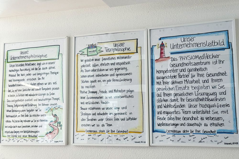 Direkt gegenüber des Wartebereichs hängen handgeschriebene Plakate mit der Unternehmens- und Teamphilosophie sowie das Unternehmensleitbild (Bildquelle: © PHYSIOMedHecker)